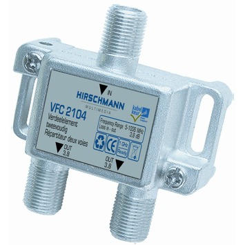 De VFC 2104 is een tweeverdeler van Hirschmann welke het signaal met 3,8 dB dempt. Deze tweeverdeler heeft een hoge isolatie en hoge afscherming om een goede werking van de installatie te garanderen. Het heeft een frequentiebereik van 5-1006 MHz en ondersteunt retour verkeer voor interactief gebruik.