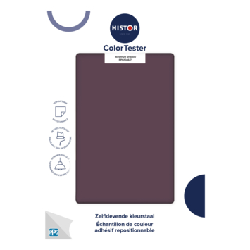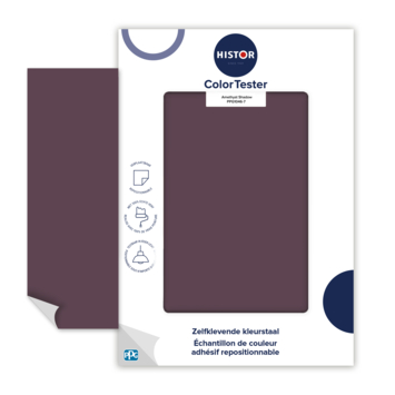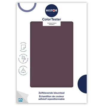 Histor MY color Kleur van het Jaar 2025 ‘Amethyst Shadow’. Met de Histor ColorTester test je jouw kleur eenvoudig op de muur. De zelfklevende kleurstaal is makkelijk te verplaatsen en ook weer van je muur af te halen.