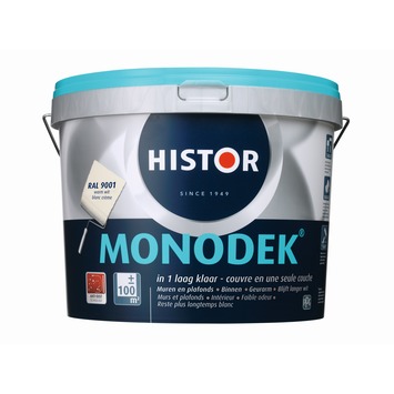 Histor Monodek latex RAL 9001 crème wit 10 liter is een matte muurverf voor plafonds en muren binnenshuis. Het is makkelijk aan te brengen en geeft een uitstekende dekking, veelal in één laag. U kunt Histor Monodek gebruiken voor steenachtige ondergronden zoals pleisterwerk, metselwerk en beton, maar ook voor gips, gipskarton en hard- en zachtboard. U kunt de latex eventueel verdunnen met water. De verflaag is na ca. 1 maand drogen reinigbaar met een vochtige doek, zodat u uw muren makkelijk schoon kunt houden.
