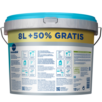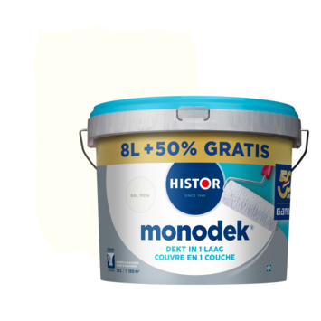 Histor Monodek latex wit 8L+50% gratis is een matte muurverf voor plafonds en muren binnenshuis. De verf is makkelijk aan te brengen en heeft een uitstekende dekking, veelal in één laag. Je kan Histor Monodek gebruiken voor steenachtige ondergronden zoals pleisterwerk, metselwerk en beton, maar ook voor gips, gipskarton, hard- en zachtboard. Je kan de latexverf eventueel verdunnen met water. Uiteindelijk zullen je muren afwasbaar zijn met een zachte borstel, zodat je ook je muren makkelijk schoon kan houden.