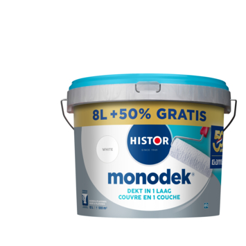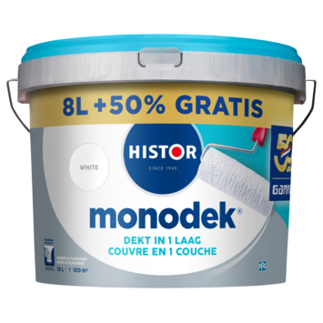Histor Monodek latex wit 8L+50% gratis is een matte muurverf voor plafonds en muren binnenshuis. De verf is makkelijk aan te brengen en heeft een uitstekende dekking, veelal in één laag. Je kan Histor Monodek gebruiken voor steenachtige ondergronden zoals pleisterwerk, metselwerk en beton, maar ook voor gips, gipskarton, hard- en zachtboard. Je kan de latexverf eventueel verdunnen met water. Uiteindelijk zullen je muren afwasbaar zijn met een zachte borstel, zodat je ook je muren makkelijk schoon kan houden.