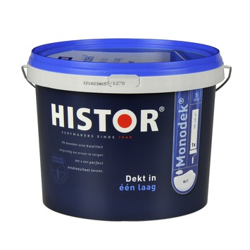 Histor Monodek 5l wit is een in één laag dekkende witte matte muurverf voor muren en plafonds binnenshuis. Deze muurverf is van hoge kwaliteit en makkelijk verwerkbaar. Na het aanbrengen van één laag ben je al klaar met je klus. Zo wordt schilderen met Histor Monodek 5l wit wel heel makkelijk.