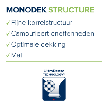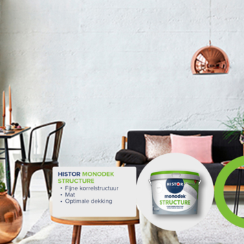 Histor Monodek Structure is een matte muurverf met een fijne korrelstructuur, geschikt voor muren en plafonds binnenshuis. Deze uitstekend dekkende muurverf camoufleert kleine oneffenheden op uw muur en is hierdoor ook geschikt voor het renoveren van de muren. Daarnaast is Histor Structuur muurverf fijn door de korrelstructuur heel sterk, waardoor de verf geschikt is voor intensief gebruikte ruimtes zoals trappenhuis en gang. De verf is ook goed overschilderbaar in een andere kleur.