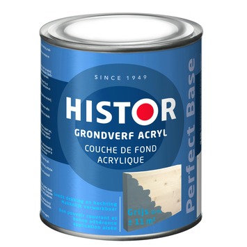 Histor Perfect Base grondverf grijs 750 ml hecht en dekt goed. De verf is watergedragen en toepasbaar op nieuw hout, bestaande verflagen, mdf plaatmateriaal en zelfs voorbehandeld staal. De inhoudsmaat is 750 ml.