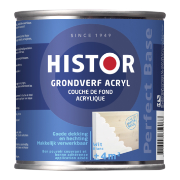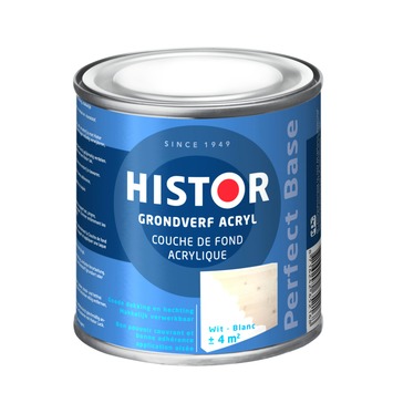 Histor Perfect Base grondverf wit 250 ml hecht en dekt goed. De verf is watergedragen en toepasbaar op nieuw hout, bestaande verflagen, mdf plaatmateriaal en zelfs voorbehandeld staal. De inhoudsmaat is 250 ml.