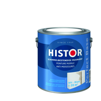 Histor Perfect Base muurverf schimmelbestendig wit 2,5 liter helpt lastige schimmelvlekken onder controle te houden. Deze elastische verf geeft schimmel geen kans in schimmelgevoelige ruimtes als badkamers. De inhoudsmaat is 2,5 liter.