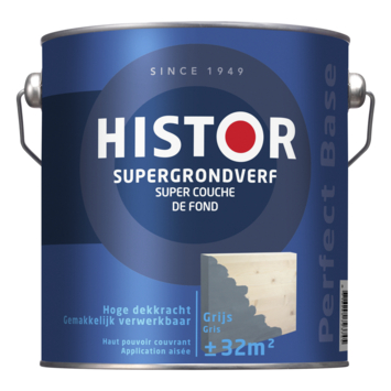 Histor Perfect Base Super grondverf grijs 2,5 liter is de beste basis voor een goede eindlaag. De grondverf is vochtregulerend en daarom geschikt voor binnen en buiten. Voor het ideale resultaat brengt u de grondlaag aan in de kleur van de eindlaag, of één tint lichter. De inhoudsmaat is 2,5 liter.