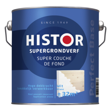 Histor Perfect Base Super grondverf wit 2,5 liter is de beste basis voor een goede eindlaag. De grondverf is vochtregulerend en daarom geschikt voor binnen en buiten. Voor het ideale resultaat brengt u de grondlaag aan in de kleur van de eindlaag, of één tint lichter. De inhoudsmaat is 2,5 liter.