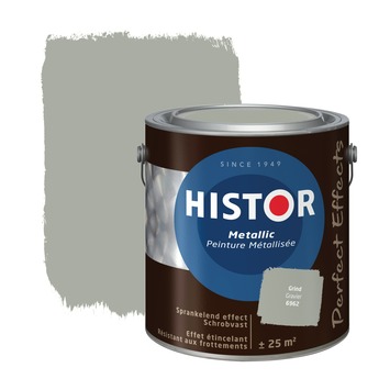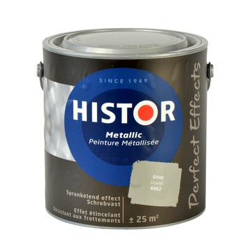 Histor Perfect Effect muurverf grind metallic 2,5 liter geeft extra glans aan uw omgeving. De reflecterende metallic deeltjes in deze muurverf zorgen voor een schitterend eindresultaat. Op een structuurondergrond bereikt u extra effect. De verf is kant-en-klaar verkrijgbaar, maar ook in een aantal kleuren op de mengmachine bij de GAMMA bouwmarkt. Laat het licht spelen met deze unieke metallic verf. De inhoudsmaat is 2,5 liter.