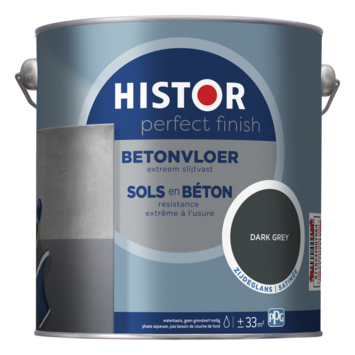 Histor Perfect Finish betonvloer RAL 7043 dark grey zijdeglans 2,5 liter is een watergedragen verf, speciaal ontwikkeld voor het schilderen van betonnen vloeren. Grondverf is niet nodig, je kan de verf direct op de ondergrond aanbrengen. De verf is extreem slijtvast, extra dekkend en geurarm. De verf is makkelijk aan te brengen en je betonnen vloer is snel weer beloopbaar. Na 2 uur is de verf stofdroog en na 6 uur overschilderbaar. Naast de kant-en-klare kleuren is deze verf in iedere gewenste kleur te mengen bij de verfmengbalie in de GAMMA bouwmarkt. Een blik van 2,5 liter is voldoende voor ongeveer 33m2.