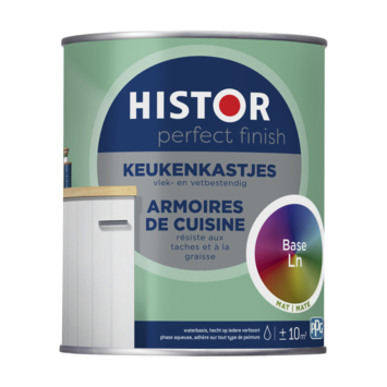 Histor Perfect Finish keukenkastjes is speciaal ontwikkeld voor het schilderen van houten of kunststof keukenkastjes. De lak is zeer geschikt voor gebruik in de keuken, want hij is vlek- en vetbestendig. Daarnaast is hij kras- en slijtvast en goed afneembaar. De lak is op waterbasis en kan gebruikt worden over elke vorige verfsoort heen, dus ook over terpentineverf. De verf is makkelijk aan te brengen en is sneldrogend. Na 1 uur is de verf stofdroog en na 5 uur overschilderbaar. Deze verf is alleen te mengen in lichte kleuren.