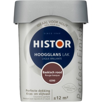 Histor Perfect Finish lak baskisch rood hoogglans 750 ml is een terpentinegedragen lak met een optimale glans. De lak dekt goed en is kras- en slijtvast. De Perfect Finish lak is geschikt voor het aflakken van hout en andere ondergronden. Deze sterke lakverf heeft een droogtijd van ongeveer 3 uur en is na 16 uur overschilderbaar. Roer de lak voor gebruik goed door. Naast de standaard beschikbare kleuren is deze verf in meer dan 30.000 verschillende kleuren te verkrijgen bij onze verfmengbalie in de GAMMA bouwmarkt. De inhoudsmaat is 750 ml.