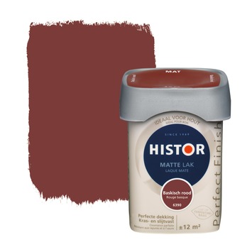 Histor Perfect Finish lak baskisch rood mat 750 ml is een watergedragen lak met een zachte, matte uitstraling. De lak dekt goed en is kras- en slijtvast. De Perfect Finish lak is geschikt voor het aflakken van hout en andere ondergronden. Deze lakverf heeft een droogtijd van ongeveer 1 uur en is na 5 uur overschilderbaar. Roer de lak voor gebruik goed door. Naast de standaard beschikbare kleuren is deze verf in meer dan 30.000 verschillende kleuren te verkrijgen bij onze verfmengbalie in de GAMMA bouwmarkt. De inhoudsmaat is 750 ml.