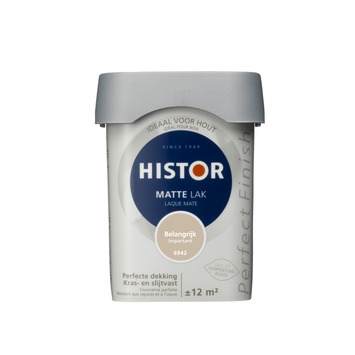 Histor Perfect Finish lak belangrijk mat 750 ml is een terpentinegedragen lak met een zachte, matte uitstraling. De lak dekt goed en is kras- en slijtvast. De Perfect Finish lak is geschikt voor het aflakken van hout en andere ondergronden. Deze lakverf heeft een droogtijd van ongeveer 3 uur en is na 16 uur overschilderbaar. Roer de lak voor gebruik goed door. Naast de standaard beschikbare kleuren is deze verf in meer dan 30.000 verschillende kleuren te verkrijgen bij onze verfmengbalie in de GAMMA bouwmarkt. De inhoudsmaat is 750 ml.