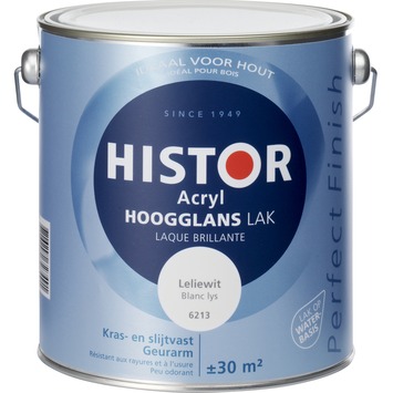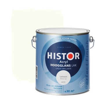 Histor Perfect Finish lak leliewit hoogglans 2,5 liter is een watergedragen lak met een optimale glans. De lak dekt goed en is kras- en slijtvast. De Perfect Finish lak is geschikt voor het aflakken van hout en andere ondergronden. Deze lakverf heeft een droogtijd van ongeveer 1 uur, is na 5 uur overschilderbaar en geeft geen sterke verfgeur af. Roer de lak voor gebruik goed door. Naast de standaard beschikbare kleuren is deze verf in meer dan 30.000 verschillende kleuren te verkrijgen bij onze verfmengbalie in de GAMMA bouwmarkt. Witte en lichte tinten op terpentinebasis kunnen bij weinig daglicht vergelen, in dit geval is Histor Perfect Finish acryl lak dan ook de beste keuze. De inhoudsmaat is 2,5 liter.