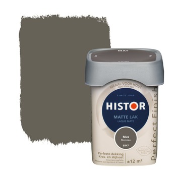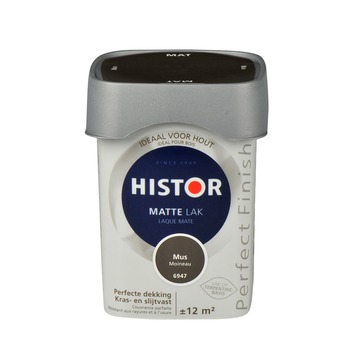 Histor Perfect Finish lak mus mat 750 ml is een terpentinegedragen lak met een zachte, matte uitstraling. De lak dekt goed en is kras- en slijtvast. De Perfect Finish lak is geschikt voor het aflakken van hout en andere ondergronden. Deze lakverf heeft een droogtijd van ongeveer 3 uur en is na 16 uur overschilderbaar. Roer de lak voor gebruik goed door. Naast de standaard beschikbare kleuren is deze verf in meer dan 30.000 verschillende kleuren te verkrijgen bij onze verfmengbalie in de GAMMA bouwmarkt. De inhoudsmaat is 750 ml.