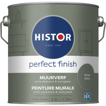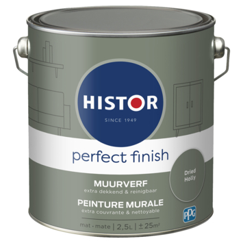 Histor Perfect Finish muurverf is Dried Holly een extra dekkende muurverf, ideaal voor alle muren in uw huis. Eenmaal aangebracht bent u verzekerd van een matte uitstraling die langdurig mooi blijft. Naast de standaard beschikbare kleuren is deze verf in meer dan 30.000 verschillende kleuren te verkrijgen bij onze verfmengbalie in de GAMMA bouwmarkt. Voor het beste resultaat kunt u het beste vooraf een dekkende voorstrijk gebruiken. Zorg voor stijlvolle, matte muren in huis met Histor Perfect finish muurverf mat. De inhoudsmaat is 2,5 liter.