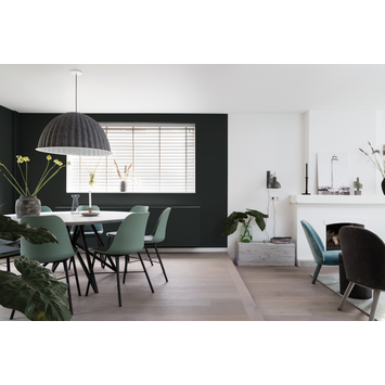 Deze verf ruik je helemaal niet en dekt met een heel dun laagje over een witte muur al perfect! Boven verwachting!