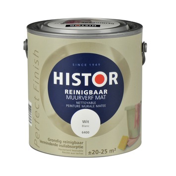 Histor Perfect Finish Muurverf reinigbaar mat 2,5l 6400 wit is een matte muurverf ideaal voor vuilgevoelige ruimtes als hal, kinderkamer, trappenhuis, keuken etc. Hardnekkige vlekken als modder, ketchup, stiften zijn namelijk makkelijk en goed te verwijderen met een schoonmaakdoekje. Uniek daarnaast is dat de muur niet gaat opglimmen na het schoonmaken, wat bij een reguliere muurverf wel het geval is. Histor Perfect Finish reinigbaar is verkrijgbaar in diverse kant-en-klare kleuren, bijvoorbeeld Histor Perfect Finish Muurverf reinigbaar mat 2,5l 6400 wit, maar ook in elke gewenste kleur op de Histor mengmachine.