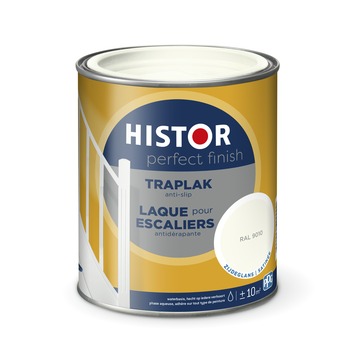 Histor Perfect Finish traplak RAL 9010 zijdeglans 750 ml 750 ml is speciaal ontwikkeld voor het schilderen van houten trappen binnenshuis. De lak is anti-slip en voelt een beetje stroef aan, hierdoor voorkom je uitglijden. De lak is zeer kras- en slijtvast, extra dekkend en geurarm. De lak is op waterbasis en kan gebruikt worden over elke vorige verfsoort heen, dus ook over terpentineverf. Voor het beste resultaat raden wij eerst het gebruik van grondverf aan. De verf is makkelijk aan te brengen en je trap is snel weer beloopbaar. Na 1 uur is de verf stofdroog en na 5 uur overschilderbaar. Naast de kant-en-klare kleuren is deze verf in iedere gewenste kleur te mengen bij de verfmengbalie in de GAMMA bouwmarkt. Een blik van 750 ml is voldoende voor ongeveer 10m2.