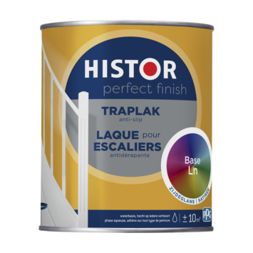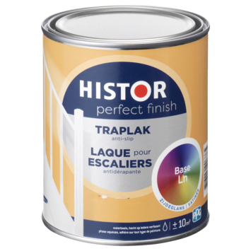 Histor Perfect Finish traplak is speciaal ontwikkeld voor het schilderen van houten trappen binnenshuis. De lak is anti-slip en voelt een beetje stroef aan, hierdoor voorkom je uitglijden. De lak is zeer kras- en slijtvast, extra dekkend en geurarm. De lak is op waterbasis en kan gebruikt worden over elke vorige verfsoort heen, dus ook over terpentineverf. Voor het beste resultaat raden wij eerst het gebruik van grondverf aan. De verf is makkelijk aan te brengen en je trap is snel weer beloopbaar. Na 1 uur is de verf stofdroog en na 5 uur overschilderbaar