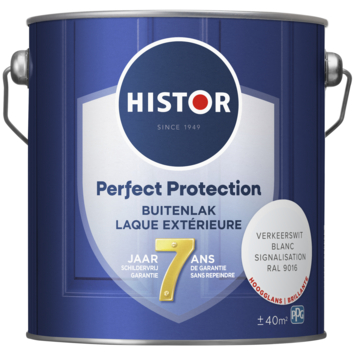 Histor Perfect Protection buitenlak hoogglans 2,5 liter schilder je houten oppervlakken zoals kozijnen en buitendeuren in de kleur RAL 9016 verkeerswit. Deze buitenlak heeft 7 jaar schildervrij garantie, wat betekent dat je nieuwe buitenlak vergoed krijgt als de lak minder dan 7 jaar meegaat. Zie de actiepagina van Histor voor alle voorwaarden. De lak is geschikt voor buitengebruik, waardoor hij bestand is tegen verschillende weersomstandigheden. Het rendement ligt op 16 m² per liter, en je verwerkt de lak het beste bij temperaturen tussen 5 en 25 graden.
