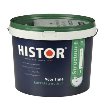 Histor Structuur Fijn 10l 7000 wit is een matte muurverf met een fijne korrelstructuur geschikt voor muren en plafonds binnenshuis. Deze uitstekend dekkende muurverf camoufleert kleine oneffenheden op je muur en is hierdoor geschikt voor het renoveren van je muren. Daarnaast is Histor Structuur Fijn door zijn korrelstructuur bestand tegen een stootje. Dat maakt de verf geschikt voor intensief gebruikte ruimtes zoals trappenhuis en gang. En mocht je over een aantal jaar een andere kleur willen, dan is Histor Structuur Fijn 10l 7000 wit goed overschilderbaar met een Histor Perfect Finish Muurverf.