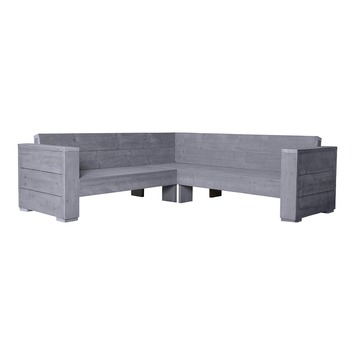 De grijze hoekbank Berlinde geeft je tuin een gezellige beachlife uitstraling. Deze loungehoekbank, volledig gemaakt van steigerhout, heeft een totale breedte van 2 x 216 cm en biedt zitplek voor 4 tot 6 personen. Je kunt de bank aanvullen met comfortabele zitkussens (los verkrijgbaar). De hoekbank Berlinde is perfect te combineren met andere steigerhouten meubels en is beschikbaar in drie kleuren: zand, wit en grijs. Kussens moeten apart worden besteld. (Deze bank wordt in 2 delen geleverd vanwege transport.) Het benodigde aantal kussens: 4 rechte sets (artikelnummer 612163 of 612164) en 1 hoekkussen (artikelnummer 612165 of 612166).