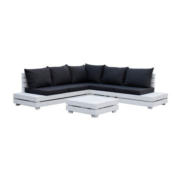 De Handmade hoekbank Calgary, gemaakt van wit steigerhout, biedt genoeg ruimte voor meer dan 5 personen. Maak je bank compleet met de luxe Bari kussens en creëer je ideale plek om te relaxen! De hoekbank heeft een hoogte van 25 cm, een diepte van 204 cm en een breedte van 230 cm. Let op: De Bari kussens zijn niet inbegrepen. Je hebt 5 kussensets Bari plof (artikelnummer 582675) en 1 los rugkussen Bari (artikelnummer 582690) nodig.