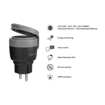 Milieuvriendelijk en kostenefficiënt De Hombli Smart Outdoor Socket 2 heeft niet alleen gerecyclede kunststof onderdelen, maar stelt je ook in staat om je energieverbruik te monitoren. Als je verspilling ziet, schakel je gewoon apparaten uit of stel je schema's in om dit voor jou te doen, waardoor je een zinvolle bijdrage levert aan het verminderen van je ecologische voetafdruk.