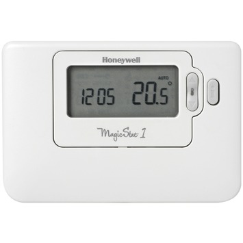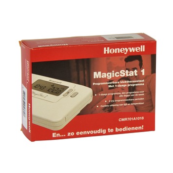 De Magicstat1 is een klokthermostaat van het merk Honeywell. De Magicstat1 is beperkt programmeerbaar en met enkele toetsen supereenvoudig te bedienen. Het grote en goed leesbare display geeft continu weergave van tijd en temperatuur. Daarnaast kan deze klokthermostaat worden gebruikt zonder het programma en kan de verwarming dus puur met de hand worden geregeld. Klokthermostaten kunnen worden toegepast in woningen die zijn aangesloten op stadsverwarming. Het is echter noodzakelijk dat de hoofdregel-afsluiter van de stadsverwarming is voorzien van een elektrisch bediende afsluiter-motor. Deze motor moet geschikt zijn voor zwakstroom 24 V besturing (bij twijfel informeren adviseren wij je hiernaar te informeren bij jouw warmwater-toeleverancier). Indien hieraan wordt voldaan, is het mogelijk om via een tweedraads-zwakstroom aansluiting de klokthermostaat in de kamer te monteren en aan te sluiten. Als een klokthermostaat wordt toegepast bij stadsverwarming, moet er in de regel een verstelling van het aantal schakelingen per uur worden gemaakt op de klokthermostaat.