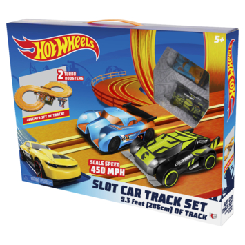 Hot Wheels Slot Car Track Set. Schaal 1:43. Baanlengte: 286 cm. Inclusief 2 auto’s met werkende koplampen en 2 controllers met turbo-functie. Wordt exclusief 6 AA-batterijen geleverd in doos met handvat. Geschikt voor kinderen vanaf 5 jaar.
