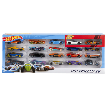 Deze set met maar liefst 20 Hot Wheels voertuigen staat garant voor heel veel speelplezier. Verzamelaars en autoliefhebbers zijn vol bewondering, genegenheid en respect voor deze geweldige voertuigen met een schaal van 1:64. Kinderen vinden het geweldig om ermee te spelen op hun baansets of om ze gewoon voort te duwen. Deze auto's zijn voorzien van klassieke decoraties en coole designs. Dankzij de verpakking met een doorzichtig venster is de hele set zichtbaar, zodat je de verschillende auto's kunt zien die je mee naar huis neemt. Met 20 auto's heb je 20 keer zoveel plezier! Begin ze meteen te verzamelen! Geschikt voor kinderen vanaf 3 jaar.
