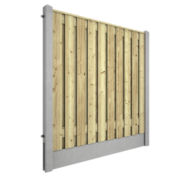 Voor het tuinscherm kun je kiezen tussen twee soorten materialen: geïmpregneerd grenenhout of douglashout. Iedere schutting staat uit 19 planken en dankzij de dichte opbouw, zorgt het scherm voor zowel veel privacy als een hoge windbelastbaarheid. Zoals op de afbeelding te zien is, wordt het scherm verticaal geplaatst. Bij een aanschaf vanaf 5 stuks aan houtbetonschutting, kan er ook een extra element toegevoegd worden zoals een gaasscherm, een hoog- of laag scherm en een schuin aflopend scherm.