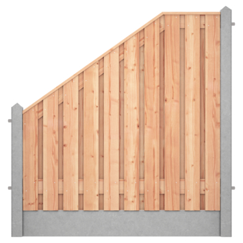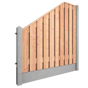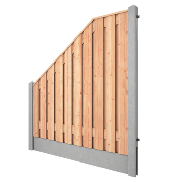 Bij aanschaf van 5 meter aan houtbetonschutting kun je extra elementen toevoegen zoals een schuin aflopend scherm. Ideaal voor een schutting langs je oprit en deze kan mooi worden gecombineerd met een laag scherm (zie artikel 193914).