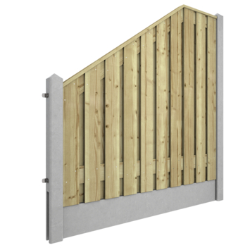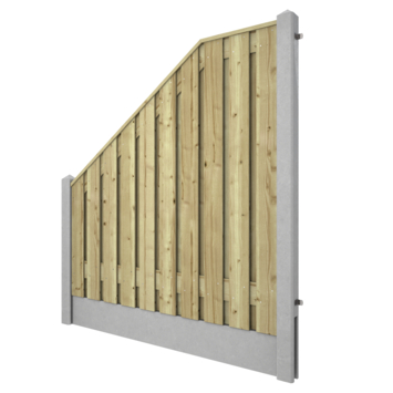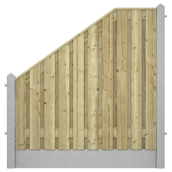 Bij aanschaf van 5 meter aan houtbetonschutting kun je extra elementen toevoegen zoals een schuin aflopend scherm. Ideaal voor een schutting langs je oprit en deze kan mooi worden gecombineerd met een laag scherm (zie artikel 193913).