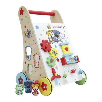 Met de houten loopwagen van Woezel en Pip beleven kinderen veel speelplezier. De loopwagen biedt tal van activiteiten als een puzzel, klok, telraam en een spiegel. Dit speelgoed is geschikt voor kinderen van 18 tot 36 maanden.