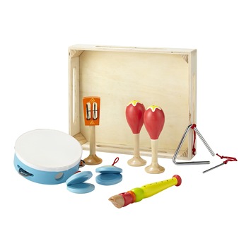 Het 8-delige houten muziekset bestaat uit een tamboerijn, maracas, castagnetten, fluit, rammelaar en een triangel. Dit speelgoed is geschikt voor kinderen vanaf 3 jaar.