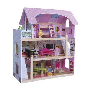 Houten poppenhuis met drie etages en een dakterras. Het huis is ingericht met een 16-delige meubelset bestaande uit een eetkamer, zitkamer, slaapkamer en badkamer accessoires. Daarnaast worden er vier bijpassende poppen meegeleverd. Het houten poppenhuis is geschikt voor kinderen vanaf drie jaar.