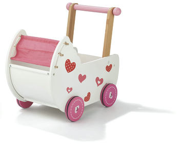 De houten poppenwagen is voorzien van geluidsarme wielen. De hoogte van de duwstang is 50 cm. Dit speelgoed is geschikt voor kinderen vanaf 1 jaar.