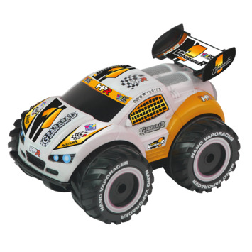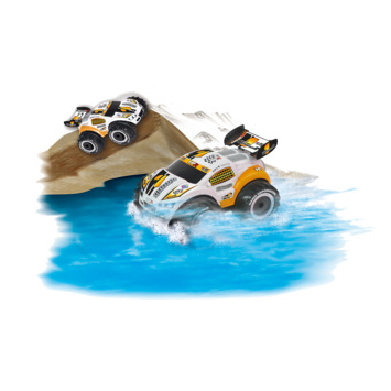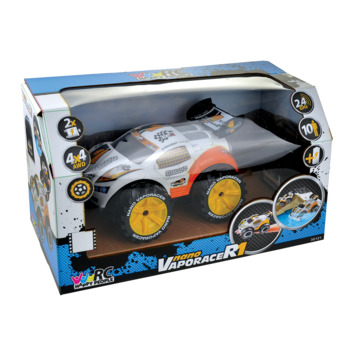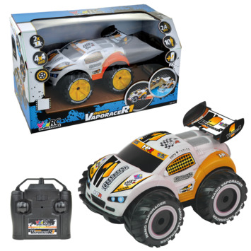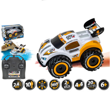 Radiografisch bestuurbare Nano VaporaceR1 auto met volledige functiebesturing (2,4 GHz). Deze gave auto in oranje kleurcombinatie is amfibisch: hij kan zowel op het water als op het land rijden! Hij kan 360 graden spins uitvoeren en is voorzien van four-wheel drive. Maximale snelheid: 8 km per uur. Lengte van de auto: 20 cm. Wordt inclusief 4 AA-batterijen voor de auto en 2 AA-batterijen voor de controller geleverd in windowbox. Geschikt voor kinderen vanaf 6 jaar.