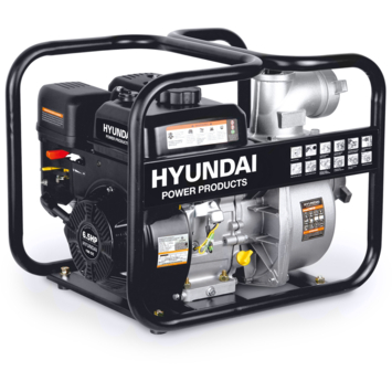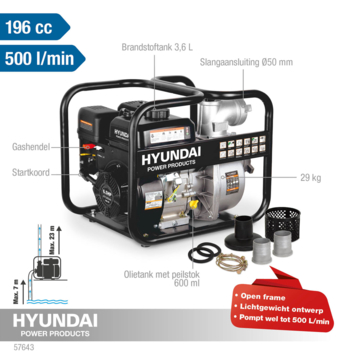 Deze zelf-aanzuigende centrifugale Hyundai schoonwaterpomp is voorzien van een krachtige 196 cc OHV-benzinemotor. De machine is geschikt voor zowel particulier als commercieel gebruik bij voorbeeld een zwembad, een landbouwgrond / tuin of op de bouwplaats. Mede door de afmeting (50 mm (2'') van de in- en uitlaat levert de machine een indrukwekkende en betrouwbare pompkracht met een stroomsnelheid van 500 liter per minuut. Deze waterpomp is niet geschikt voor gebruik met zeewater of andere water gemend met chemicaliën, omdat dit de interne onderdelen kan beschadigen. Wel kunnen onderdelen in het water, met een diameter tot 7 mm, worden verpompt en biedt de machine een aanzuighoogte van 7 meter en een totale opvoerhoogte van 23 meter. Met een gewicht van slechts 29 kg is dit een lichtgewicht waterpomp. Eenvoudig te transporteren en op te slaan dus. Het robuuste, open frame beschermt de pomp tegen schokken en stoten en dienen tevens als handgrepen om de waterpomp te verplaatsen. Belangrijkste voordelen: - Lichtgewicht; slechts 29 gram. - Compacte bouw met een open frame. - Pompt een indrukwekkende 500 liter per minuut. - Aanzuighoogte van maar liefst 7 meter en opvoerhoogte van wel 23 meter. Productspecificatie: - Motorinhoud; 196 cc (Type LS 196) EURO5. - Inhoud brandstoftank; 3.6 liter. - Brandstoftype: Benzine - Euro 95/98 (E10 Loodvrij). - Brandstofverbruik; 380g/kWh. - Bij continue gebruik; 1,8u. - Inhoud oliereservoir; 0.6 liter. - Olietype; SAE 10W-30. - Maximaal vermogen @ 3600 tpm; (pk / kw) 6,5 / 4,85. - Aandrijving type; directe aandrijving. - Startmethode; trek-startkabel. - Inlaat (inches / mm); 2"/ 50 mm. - Uitgang (inches / mm); 2"/ 50 mm. - Geluidsdruk LpA: 103 dB(A). - Maximale stroomsnelheid; 500 (liter / minuut). - Pomphuis materiaal: aluminium. - Totale opvoerhoogte; 23m. - Aanzuighoogte; 7 meter. - Afmeting in gebruik; 480 x 380 x 420 mm (LxBxH). - Gewicht in gebruik; 29 kilogram. - Garantie: 2 jaar.