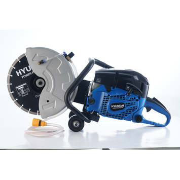 Bij het afwerken van een bestrating is het vaak nodig om stukken van de betegeling of bestrating af te zagen in een rechte lijn, Met deze Hyundai betonzaag 58cc gaat dit zeer precies en eenvoudig, Met zijn krachtige 58cc benzinemotor en diamanten zaagblad van 300 mm, kan deze cirkelzaagmachine tot 105 mm diepte zagen, Het grote handvat dat zich boven het zwaartepunt van de machine bevindt, zorgt ervoor dat deze draagbare diamant cirkelzaagmachine gemakkelijk te manoeuvreren is voor al het zaagwerk, Voor lange rechte stukken zijn er speciaal twee steunwielen aan het frame gemonteerd, Hierdoor is het mogelijk de machine te kantelen over de as van de wielen en zodoende, zonder de machine te hoeven dragen, de zaag zeer gecontroleerd in de bestrating te laten zakken en rijdend over de wielen voort te bewegen, Omdat het zwaartepunt van de machine achter de wielen ligt kan de machine ook op de wielen worden neergezet, zonder dat het zaagblad de grond raakt, als hij niet gebruikt wordt, De waterkoeling van deze bandenzaag is gerealiseerd middels een slang die voorzien is van een Gardena-koppeling, die het water injecteert in de beschermkap van de cirkelzaag, Unieke specificaties; - Merk; Hyundai Power Prodcuts, - Cylinder inhoud: 58cc, - Motor; 2-takt luchtgekoeld Euro V, - Vermogen; 2400W, - Onbelast toerental; 2800-3200 toeren per minuut, - Zaagdiepte; 105mm, - Zaagsnelheid; 4800 rotaties per minuut, - Incl, 300mm diamanten zaagblad (25,4mm asgat), - Voorzien van 2 wielen, - Inhoud benzinetank; 550ml, - Waterkoeling voorzien van Gardena-koppeling, - Gewicht; 15,4 kilogram, - Garantie; 2 jaar.