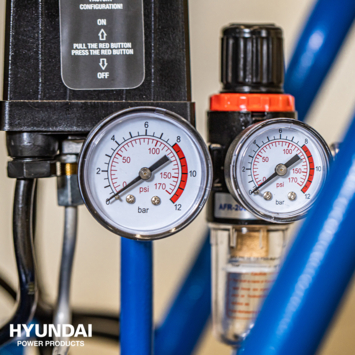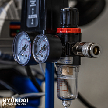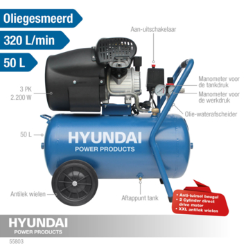 Schoonblazen, oppompen of pneumatisch aandrijven? Deze oerdegelijke, maar krachtige Hyundai compressor zorgt voor lucht in elke situatie, De machine zuigt lucht aan, perst het samen in de riante 50 liter ketel en laat het vervolgens gedoseerd los via de slang of het gekoppelde hulpgereedschap, Een zeer flexibel apparaat voor het schoon- en wegblazen van vuil, het oppompen van allerlei banden en materialen en het aandrijven van (industriële) apparaten en gereedschappen, Een oliegesmeerde compressor geschikt voor zowel de professional als doe-het-zelf'er, Deze Hyundai compressor is voorzien van een stille motor, waardoor het geluidsniveau minimaal is; slechts 69 dB, Bovendien is de compressor zeer stabiel door de extra stevige uitvoering; 2 voetsteunen met anit-vibratie doppen én een anti-tuimelbeugel, De compressor is verder volledig verrijdbaar door 2 soepele, anti-lek wielen, Deze compressor is voorzien van een vochtafscheider, tankdrukmeter, drukregelaar, druk-regelaarmeter en een orion/eu snelkoppeling waardoor luchtgereedschap gemakkelijk is aan te sluiten, Unieke specificaties; - Schoonblazen, oppompen en pneunmatisch aandrijven, - Voltage; 230V - 50 Hz, - Ketel inhoud; 50 liter, - Maximale werkdruk; 8 bar, - Motor vermogen: 2200W / 3,0 PK, - Aantal cilinders; 2, - Toerental; 2850 per/minuut, - Isolatieklasse motor; B, - Oliegesmeerd; SAE30 / SAE10, - Aanzuigvermogen; 320 liter/min, - Geluidsniveau; 69dB(!), - Anti-vibratie ondersteuning; 2 voetsteunen, - Eenvoudig verrijdbaar dankzij 2 soepele, anti-lek wielen, - Inclusief geïntegreerde anti-tuimel beugel, - Afmeting in gebruik; 37x67x70cm - Gewicht; 37,9 kilogram, - Garantie; 2 jaar, - Geleverd met vochtafscheider, tankdrukmeter, drukregelaar, druk-regelaarmeter en een orion/eu snelkoppeling,