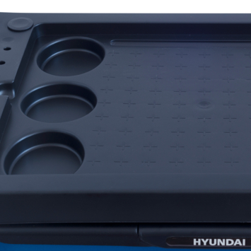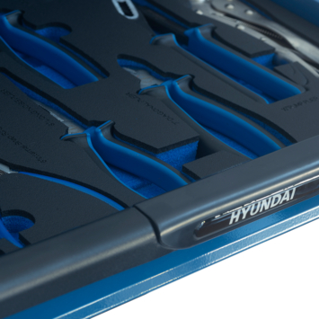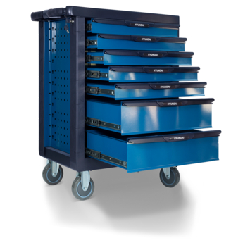 Deze gereedschapswagen van Hyundai is van alle markten thuis en volgeladen met verschillend gereedschap. Hij bevat 7 lades waarvan 5 gevuld zijn. Van ratels, doppensets, tangen, ring-steeksleutels tot schroevendraaiers en torx- en inbussleutels.