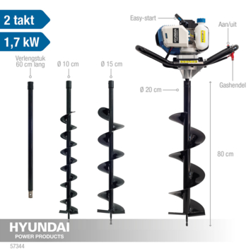 Met de Hyundai grondboor boort u moeiteloos gaten in de grond voor het plaatsen van palen, hekken, funderingen maar ook bomen en struiken. De luchtgekoelde krachtige 50,8 cc tweetaktmotor heeft enorm koppel in het middenbereik, zodat de machine tijdens het boren niet met de maximale toeren hoeft te werken. Dit zorgt voor een aangenamere, stillere gebruikerservaring en verlaagt het brandstofverbruik, terwijl de lange levensduur van de motor wordt bevorderd. De eenvoudig te bedienen machine is voorzien van een volledig gesloten anti-vibratiesysteem om stress en vermoeidheid van de armen en rug van de gebruiker te verminderen en heeft een “easy-start-technologie” om gemakkelijk het startkoord te trekken. De grote trilling-beperkende stuurgreep draagt zorg voor controle van en over de diepte van de boor.