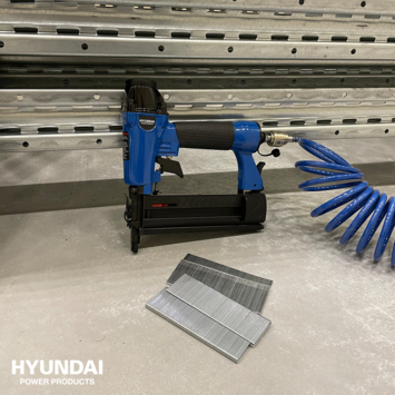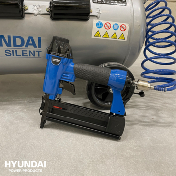 Met deze lichtgewicht Hyundai persluchttacker kunnen zowel nieten als spijkers worden bevestigd en is geschikt voor het afwerken van meubels tot het vastzetten van plinten. Deze persluchttacker is voorzien van een universele DIN en Orion koppeling waardoor de tacker eenvoudig aangesloten kan worden op een compressor. De tacker kent een verstelbare diepte aanslag om de spijkers (nagels) snel en gemakkelijk op de juiste diepte in te stellen. De machine wordt geleverd in een handige kunststof bewaarcassette.