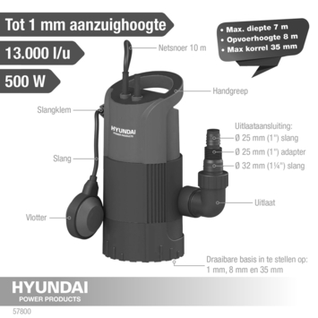 Zoekt u een betrouwbare oplossing voor al uw pompwerkzaamheden? Deze krachtige Hyundai 500 W vuilwater vlakzuigpomp is de ideale keuze! Perfect voor het leegpompen van vijvers, bouwputten, volgelopen kelders en nog veel meer. - Krachtige Prestaties: Met 500 W vermogen biedt deze dompelpomp uitstekende prestaties voor diverse toepassingen. - Onderhoudsvrij: Geniet van zorgeloos gebruik zonder de noodzaak voor regelmatig onderhoud. - Gebruiksvriendelijk: Voorzien van een praktische handgreep voor eenvoudig transport en plaatsing. - Flexibele Aansluitmogelijkheden: De 10 m lange M1 aansluitkabel biedt veel bewegingsvrijheid, en de universele slangaansluiting kan worden ingesteld voor vier verschillende slangdiameters. - Nauwkeurige Waterafvoer: Dankzij de 3-traps instelbare roterende basis kunt u water tot op 1 mm afpompen, zodat u zelfs de kleinste hoeveelheden kunt verwijderen. Deze veelzijdige pomp is niet alleen krachtig, maar ook ontworpen met gebruiksgemak en efficiëntie in gedachten. Of u nu een professional bent of een enthousiaste doe-het-zelver, deze pomp is onmisbaar voor uw klus! Breng uw pompwerkzaamheden naar een hoger niveau met de Hyundai 500 W vuilwater vlakzuigpomp – de betrouwbare partner voor al uw waterafvoerbehoeften! Unieke productvoordelen; - Instelbaar op 4 hoogtes - 10 m M1 aansluitkabel - 13.000 L/u