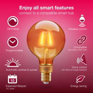 Deze echt glazen lamp heeft een lichtopbrengst van 350 lumen. Door de gouden coating op het glas zorgt de slimme lamp voor warm wit licht en is het een echte sfeermaker.