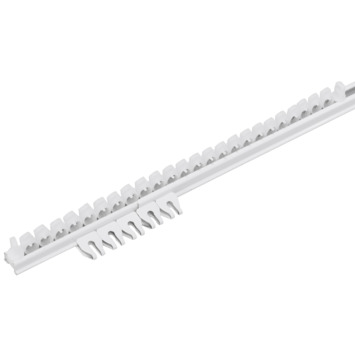 De Intensions complete set gordijnrail Plus wit 200 cm is een kwalitatief goede, wit metalen gordijnrail. De rail is slank vormgegeven en is uitgevoerd in de kleur wit. De rail heeft een lengte van 200 cm en wordt helemaal compleet geleverd inclusief 5 montagesteunen geschikt voor plafondmontage, 24 runners om de gordijnen aan op te hangen en 2 eindstoppers om de rail af te sluiten. De rail is gemakkelijk op maat te maken met een ijzerzaag. De rail is geschikt om alle type plooigordijnen aan op te hangen. Bij deze rail kunnen diverse accessoires gekocht worden zoals montagesteunen voor montage aan de wand, 2 soorten bochten en diverse onderdelen. De rail kan ook verlengd worden met een verbinder waardoor er gemakkelijk 2 rails aan elkaar gekoppeld kunnen worden. Let er wel op dat de gordijnen wat stroever kunnen glijden bij het verbindingsstuk. Het gebruik van een trekstang wordt bij het verlengen van de gordijnrail aangeraden.